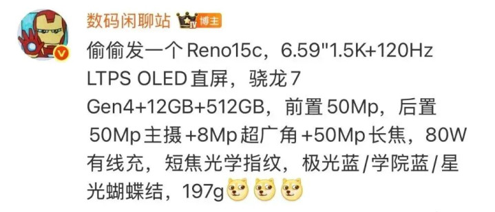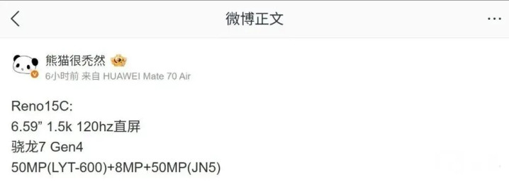 更早之前,据博主@熊猫很秃然 也发文透露过,OPPO Reno 15c 手机将搭载 6.59 英寸 1.5K 120Hz 直面屏幕。配备高通骁龙 7 Gen 4 芯片,配备 5000 万像素 LYT-600 主摄,其余两颗摄像头由 800 万像素 CMOS、5000 万像素三星 JN5 传感器组成。