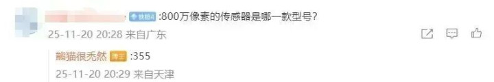 就博主评论区回复来看,这颗 800 万像素的 CMOS 应该是 IMX355,尺寸是 1/4 英寸。